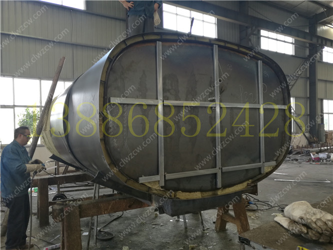 3. 保層溫的制作是在水罐外部另外焊接10mm厚的支撐骨架,然后用保溫材料將骨架內部填充滿,最后在骨架外蒙上一層外皮。 保溫層外表鐵皮采用8mm厚高強度耐磨板,可選擇使用不銹鋼分鏡面8K或磨砂板