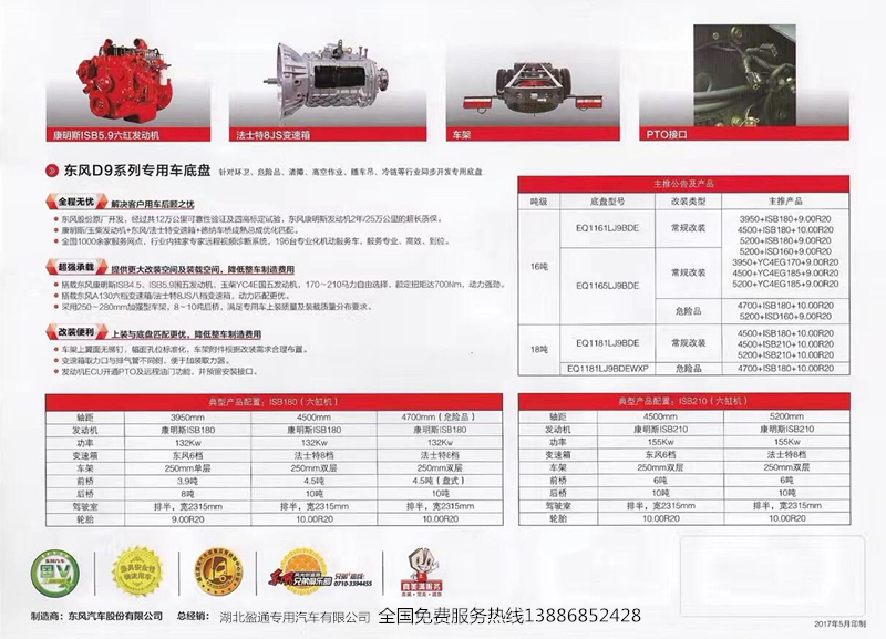 東風(fēng)多利卡D9,3950/4500軸距,玉柴200馬力/康明斯195馬力,4缸機(jī),法士特八檔(高低速),9.00R20胎,斷氣剎,電動(dòng)玻璃,空調(diào)
