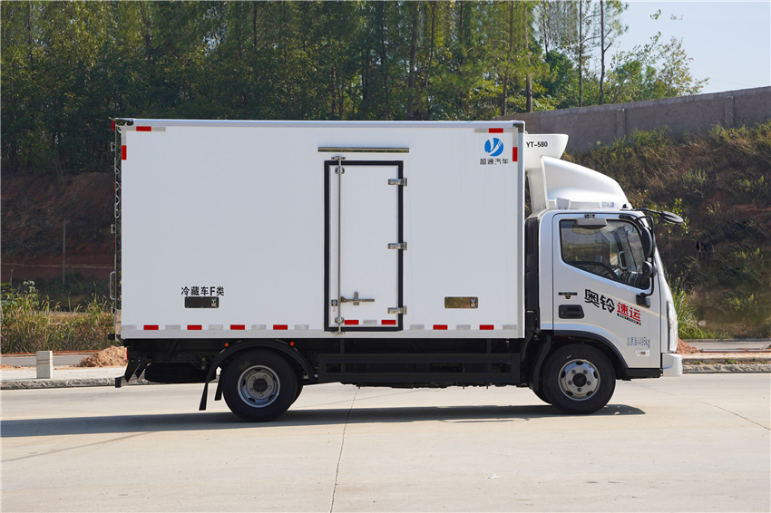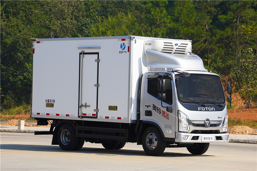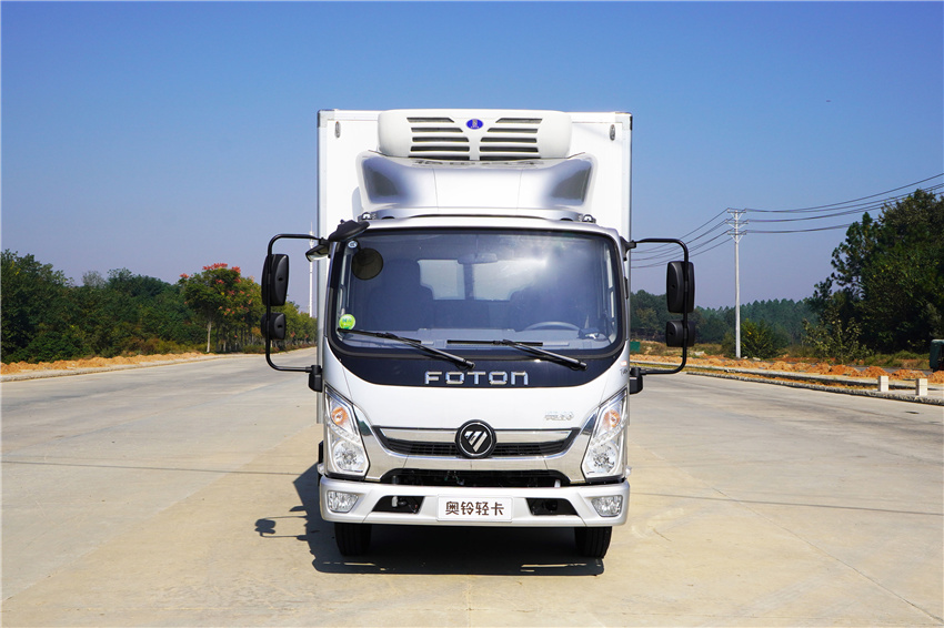 奧鈴速運冷藏車采用福田康明斯131/150/156馬力(F2.8NS6B131/F2.8NS6B150/F2.8NS6B156)發(fā)動機,采埃付5擋變速箱,NPR沖壓后橋(帶制動襯片磨損報警),7.00R16輪胎,斷氣剎、單排翻轉、車載無線服務控制器(T-BOX)、ABS、離合助力、動轉,