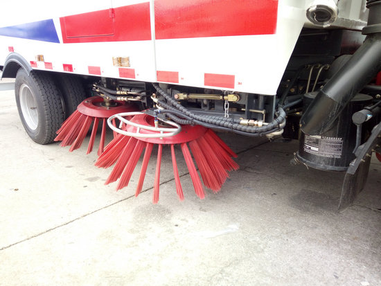 8、左右立掃為雙掃盤,掃刷上加裝噴水裝置,用于噴霧降塵。左右立掃分開控制,可實現(xiàn)右掃和全掃等不同的作業(yè)模式。