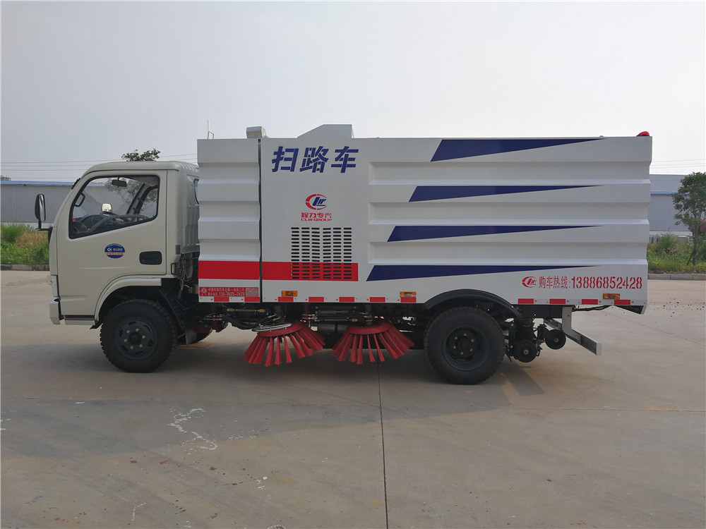 該掃路車采用東風多利卡二類底盤改裝,加裝副發(fā)動機、風機、清水箱、垃圾箱、左右立掃、掃盤降塵系統(tǒng),液壓系統(tǒng)、專用裝置電控系統(tǒng)和副車架等改裝而成。